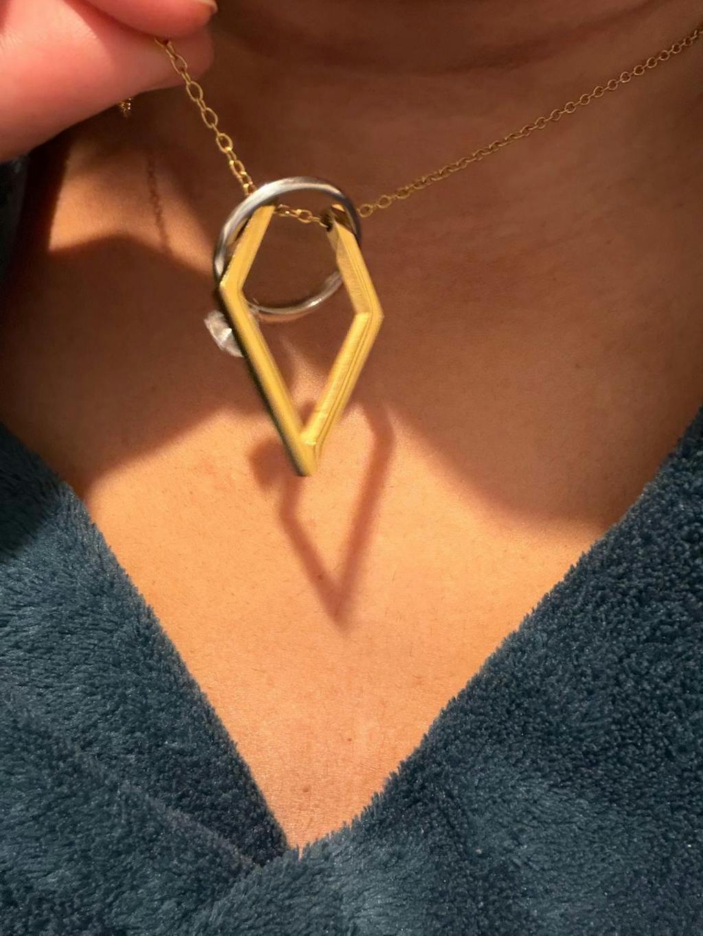 The Rhombus Necklace in Gold offers a sophisticated solution for keeping your treasured rings close. Designed for effortless use, it allows you to wear your cherished rings elegantly around your neck or on your hands, combining style with practicality. Its refined craftsmanship ensures both security and ease, making it an essential accessory for those who value both beauty and convenience.